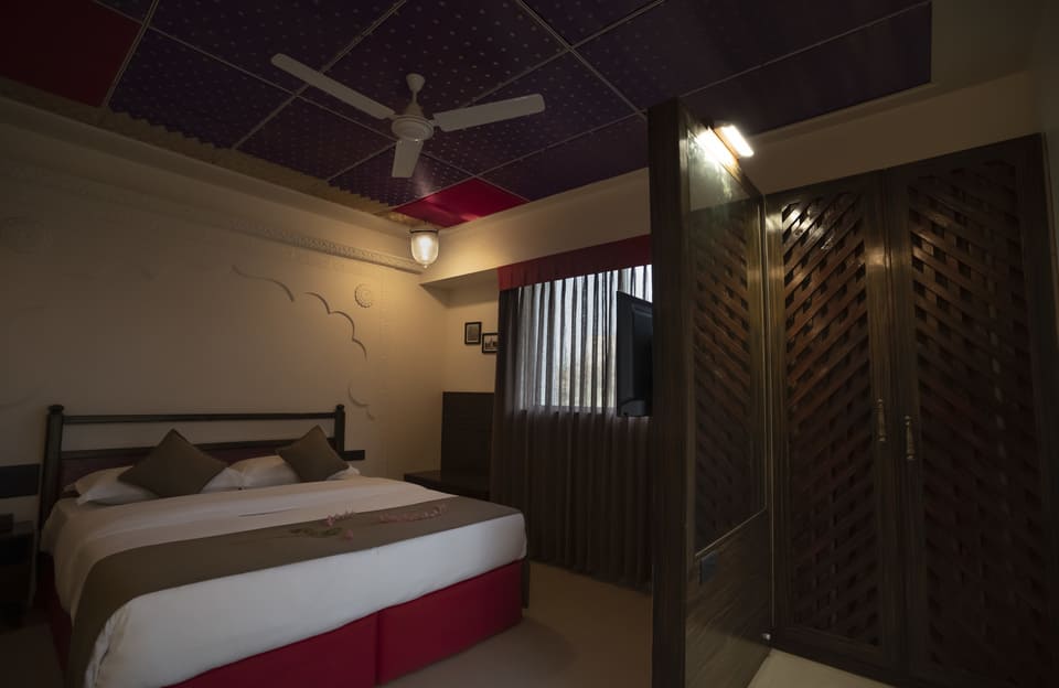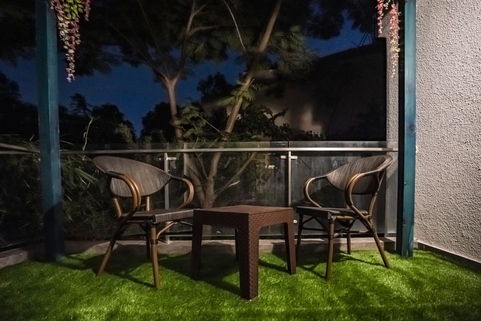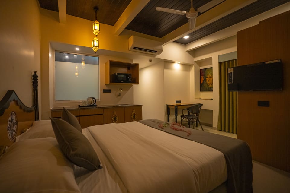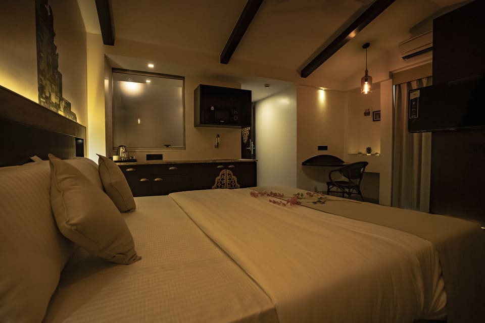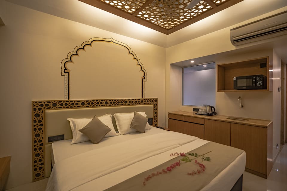 The suite offers a cosy living area & a panoramic view in the personal sit-out terrace. High-quality bed linens atop the king bed and plush interiors make this suite opulent yet understated. .